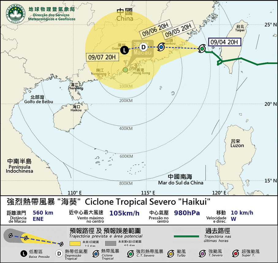 According to the observatory, Haikui was located about 560-kilometres east-northeast of Macau at 8 p.m. yesterday.