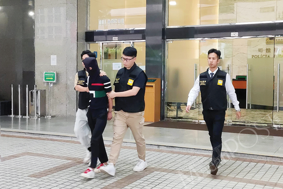 Judiciary Police (PJ) officers escort the fraud suspect to a PJ vehicle outside the PJ headquarters.