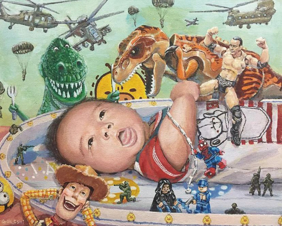 A portrait painting depicting Chan’s first born surrounded by toys titled “Party”.