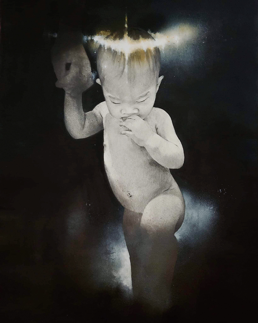 A portrait painting by Chan of his second son with his wife’s hand titled “Halo”.