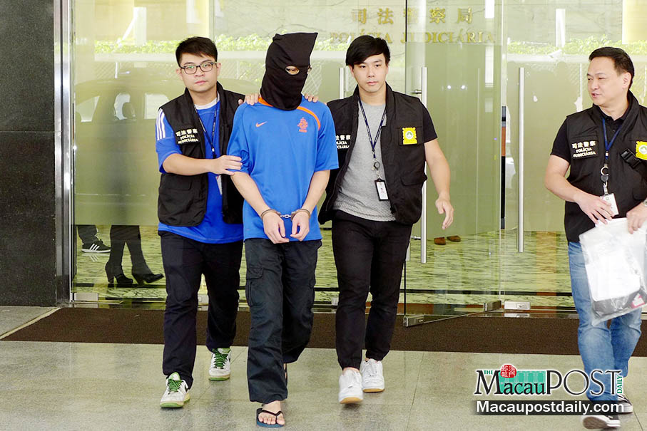 Judiciary Police (PJ) officers escort the hooded domestic violence suspect to a vehicle from the PJ headquarters in Zape yesterday. Photo: Iong Tat Choi
