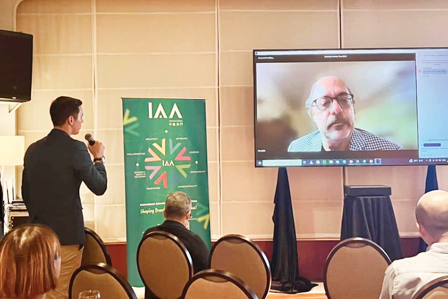 IAA Chairman & Chief Brand Officer of Stein IAS Tom Stein delivers a speech by video link from New York City during yesterday’s seminar at Artyzen Grand Lapa hotel in Nape. – Photo courtesy of IAA Macao China