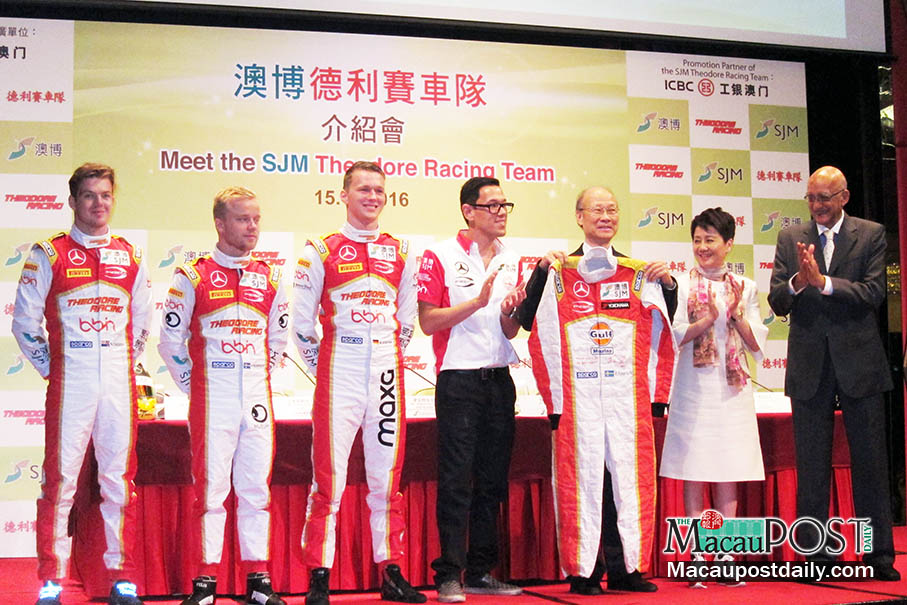 SJM Theodore Racing Team presents Felix Rosenqvist’s signed winning race suit from 2015 Macau Grand Prix to SJM for the exchange of souvenir. (From left) SJM Theodore Racing team drivers Nick Cassidy, Felix Rosenqvist and Maximilian Gunther, Team Principal of SJM Theodore Racing Teddy Yip Jr., SJM Board of Director Chairman Ambrose So Shu Fai, SJM Managing Director and Chief Administrative Office Angela Leong On Kei and SJM Director Rui Cunha. Photos: Monica Leong
