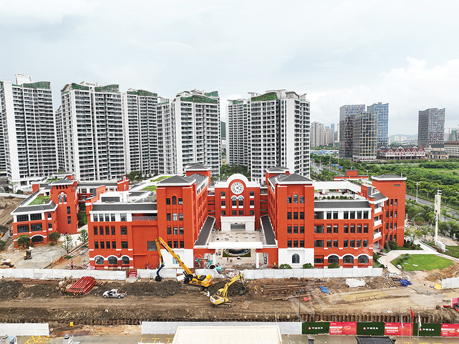 This undated handout photo released by Macau Urban Renewal Limited (MUR) on Sunday shows road works being carried out outside a school in the Macau New Neighbourhood (MNN) residential estate in Hengqin.