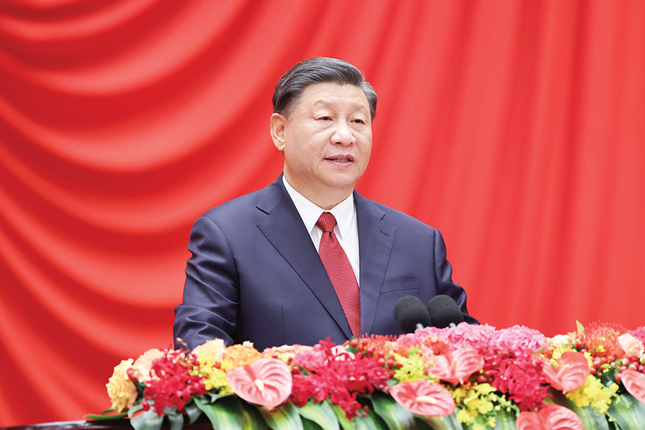 President Xi Jinping, also general secretary of the Communist Party of China Central Committee and chairman of the Central Military Commission, addresses a grand reception to celebrate the 74th anniversary of the founding of the People’s Republic of China at the Great Hall of the People in Beijing yesterday. – Xinhua