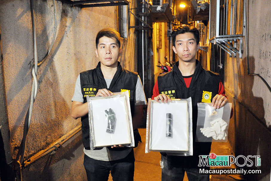 Two Judiciary Police (PJ) officers yesterday show reporters the taser and the spray that the two robbers used in the attempted robbery case, in Iao Hon district. – Photo: MPDG