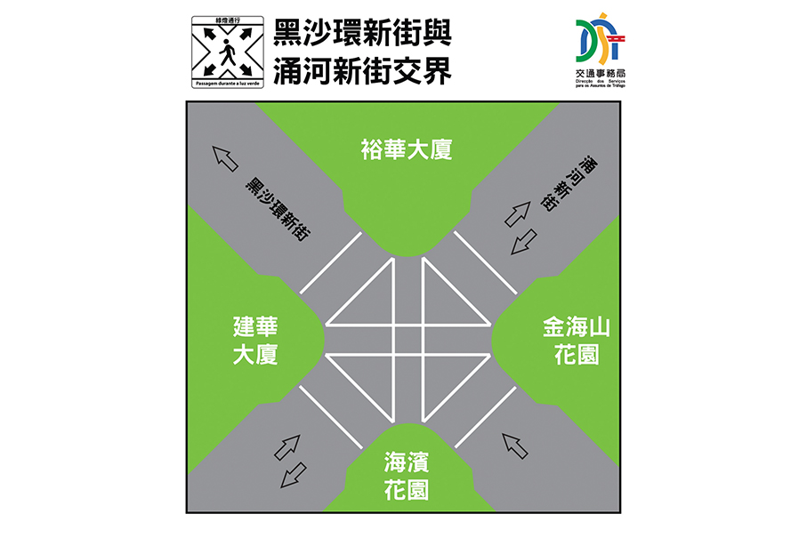 An X crossing (aka pedestrian scramble or diagonal crossing) will come into use tomorrow at the junction of Rua Nova da Areia Preta (黑沙環新街) and Rua do Canal Novo (涌河新街) in Areia Preta district, the Transport Bureau (DSAT) announced in a statement yesterday.