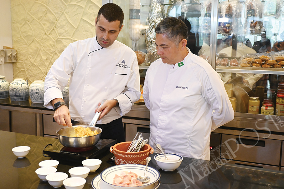 Chef Pedro (left) and Chef Neta conduct a live cooking demonstration of the Macanese dish “Galinha Chau Chau Parida” at the Artyzen Grand Lapa Macau hotel in Nape. – Photo: Rui Pastorin
