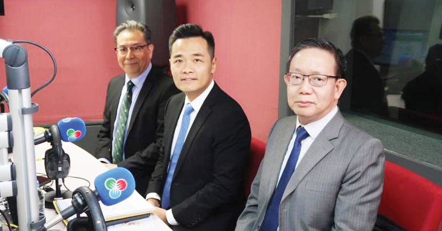 Consultant Physician O Heng Kin of the Health Bureau’s Tobacco Prevention and Control Office (left), Health Bureau (SSM) Director Alvis Lo Iek Long (centre), and Disease Prevention and Control Centre Director Lam Chong pose during yesterday’s phone-in programme hosted by public broadcaster TDM’s Chinese-language radio station, Ou Mun Tin Toi. – Photo courtesy of TDM