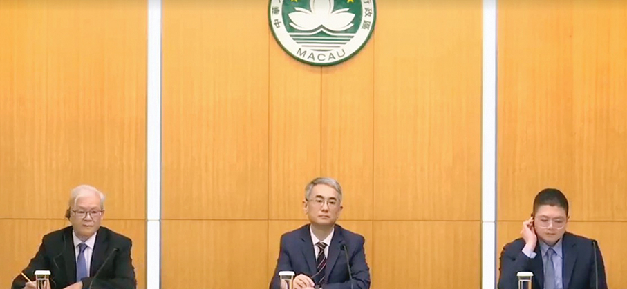 Secretary for Administration and Justice André Cheong Weng Chon (centre), Labour Affairs Bureau (DSAL) Director Wong Chi Hong (left), and DSAL Deputy Director Chan Chon U listen to a reporter’s question during Friday’s Executive Council press conference at Government Headquarters. – Photo courtesy of TDM