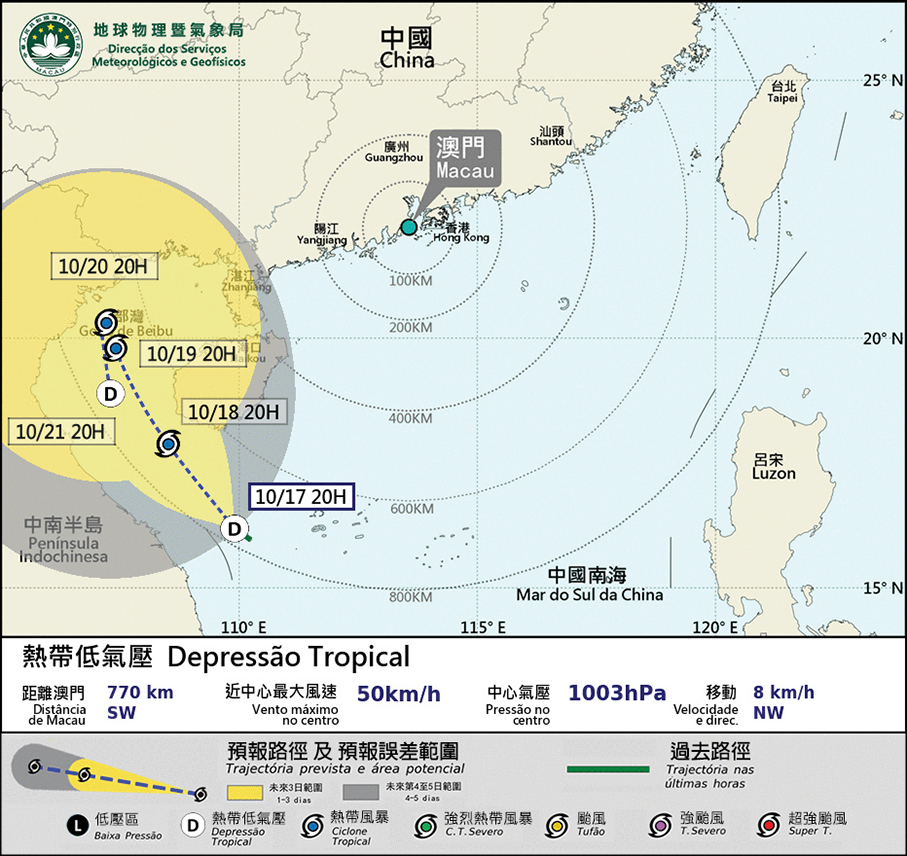 The Meteorological and Geophysical Bureau (SMG) forecast on its website yesterday that a low-pressure area to the south of Hainan province has developed into a tropical depression moving towards the Beibu Gulf, resulting in frequent showers, strong winds, and even minor flooding in the Inner Harbour area.