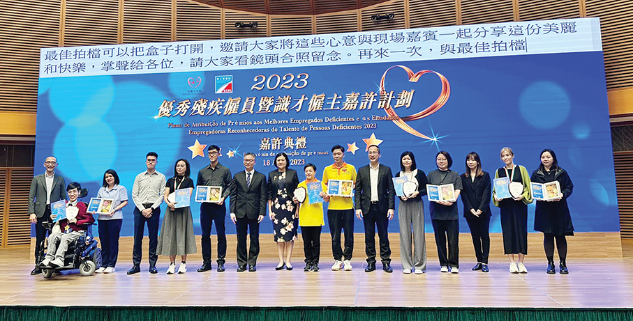 Awarded employers and excellent employees with disabilities pose for a group photo yesterday during a ceremony jointly held by the Social Welfare Bureau (IAS) and the Labour Affairs Bureau (DSAL) at the Macau Science Centre (MSC).
