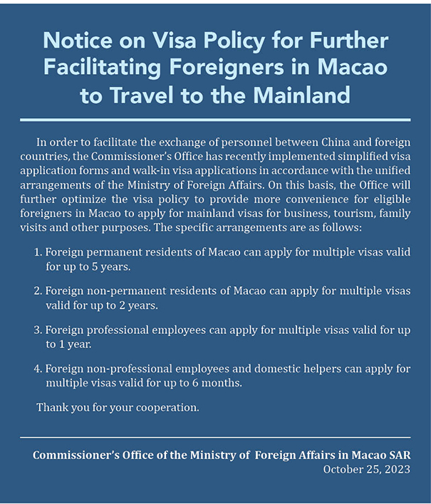 Important notice by China's Foreign Ministry Commission about mainland visas for foreigners in Macau