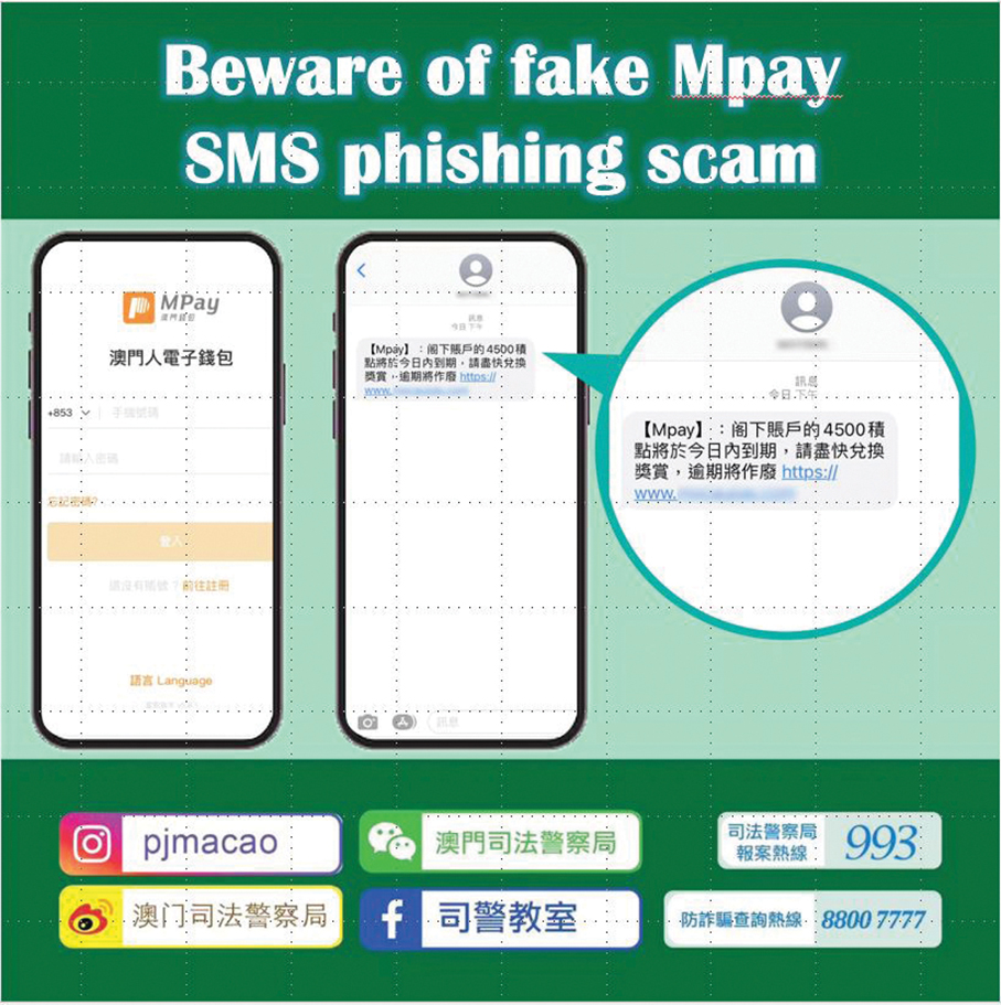 The Judiciary Police (PJ) warned members of the public of a “phony MPay phishing SMS scam” in a statement yesterday, noting that 11 residents were affected by the scam between October 25 and November 3 that led to a total loss of nearly 80,000 patacas.
