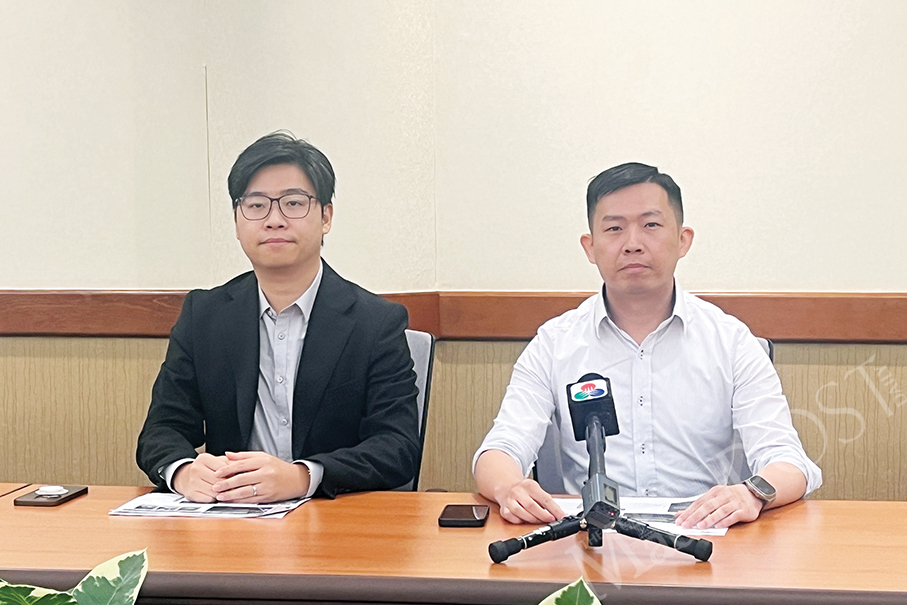 The government-appointed Northern District Community Service Consultative Council’s deputy convener Chan U Iong (right) and member Xu Zhiwei look on during yesterday’s press briefing after yesterday’s regular meeting at the Government Service Centre in Areia Preta. – Photo: Yuki Lei