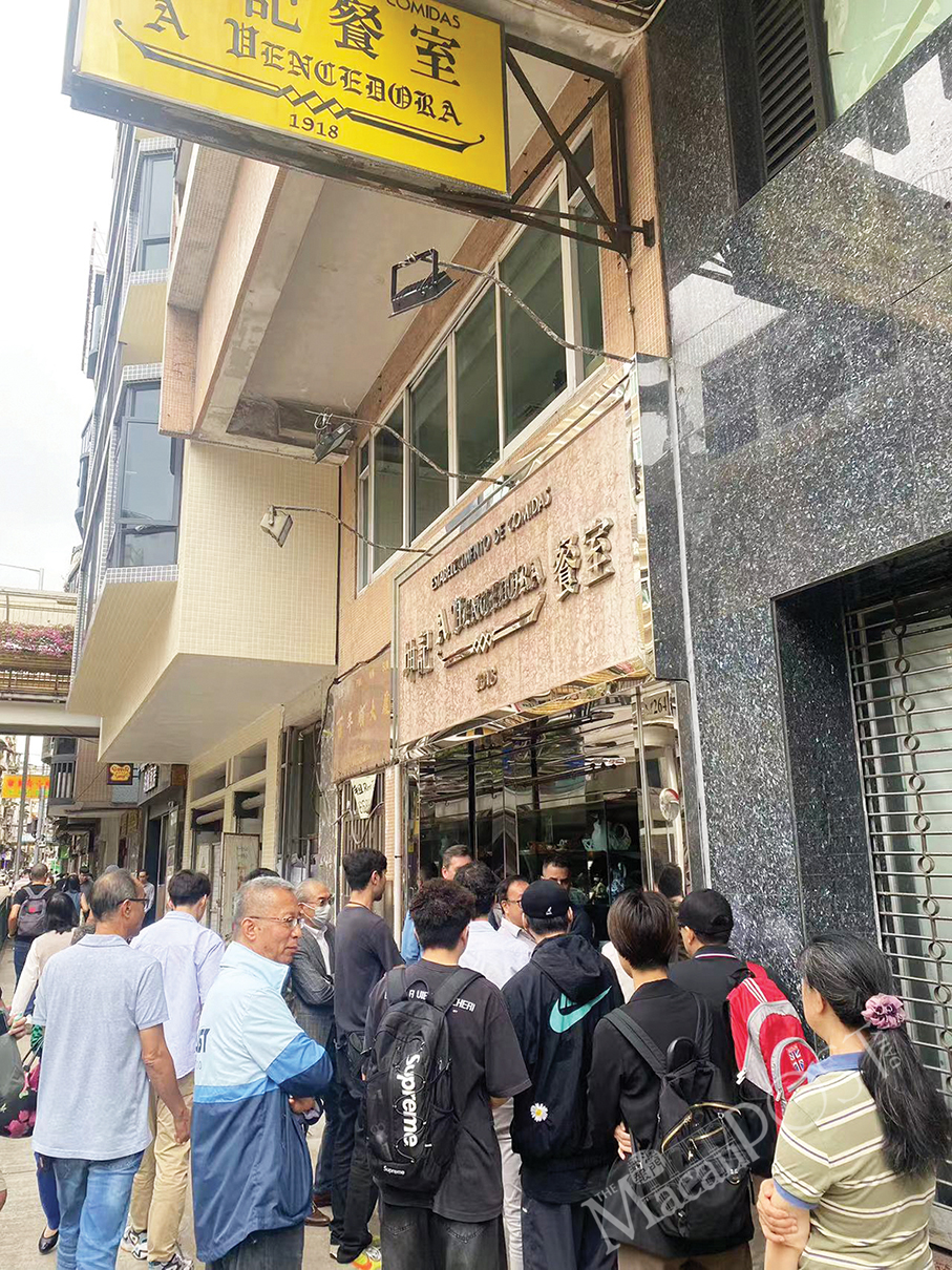 Customers queue up for lunch outside “A Vencedora” on Rua do Campo yesterday, the penultimate day of its 105-year existence as a restaurant serving Macau-style Portuguese food. – Photo: Gabriel Tam