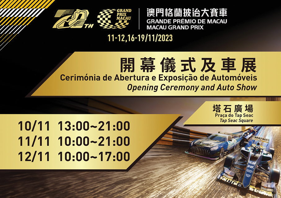 This poster jointly provided by the Macau Grand Prix Organising Committee (MGPOC) and the Sports Bureau (ID) promotes the auto show in Praça do Tap Seac, which opens today, and its opening hours.