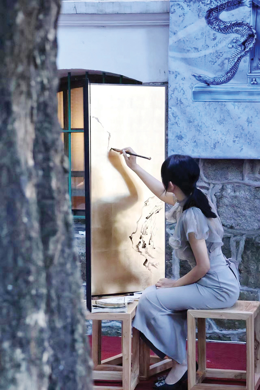 This photo shows Tsang working on her painting “Pine and Stone” (松石圖) on a two-fold gold-leafed screen during the exhibition’s opening ceremony on November 5 at 10 Fantasia gallery.