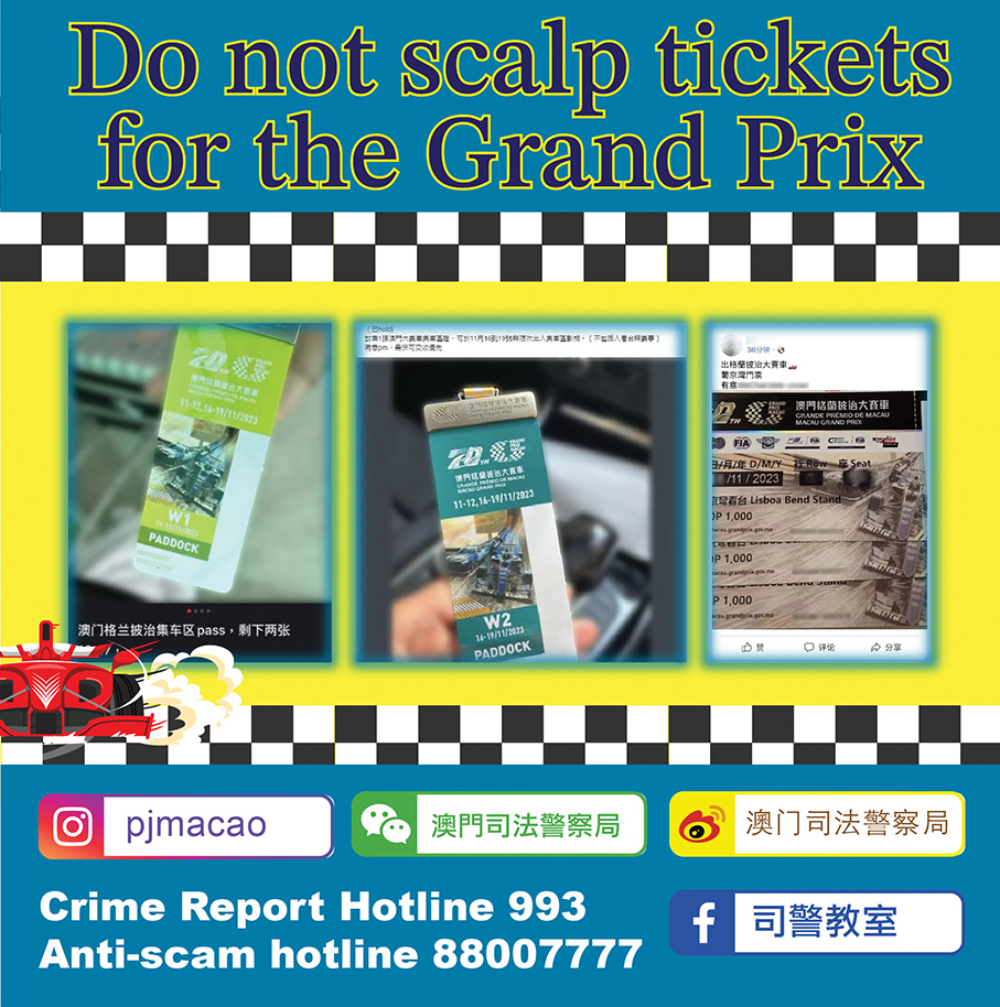 The Judiciary Police (PJ) urged members of the public in a statement yesterday not to scalp tickets for the 70th Macau Grand Prix (MGP), noting that they have recently discovered people selling fixed-price and complimentary tickets, as well as special passes, on social media.