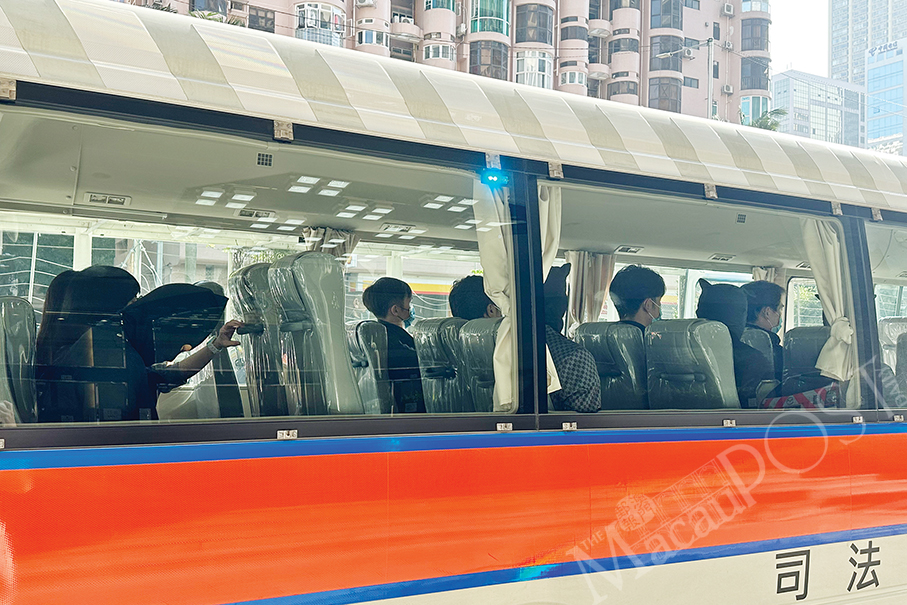 The five hooded mainlanders suspected of defrauding a local casino with bogus chips are escorted by police officers in a vehicle in front of the Judiciary Police (PJ) headquarters in Zape. – Photo: Yuki Lei