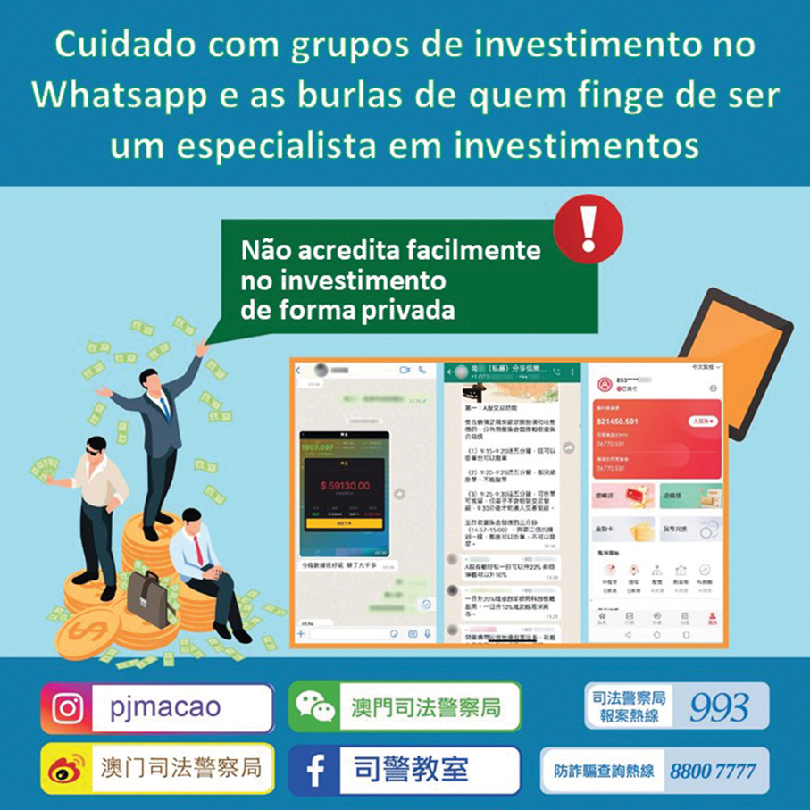 This Portuguese-language poster provided by the Judiciary Police (PJ) yesterday warns the public to beware of investment scams via WhatsApp by purported “investment specialists”.