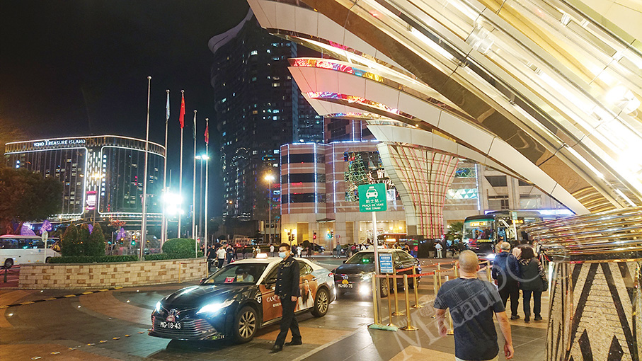Two taxis wait for passengers at the taxi rank outside the Grand Lisboa hotel-casino tower last night. – Photo: Tony Wong