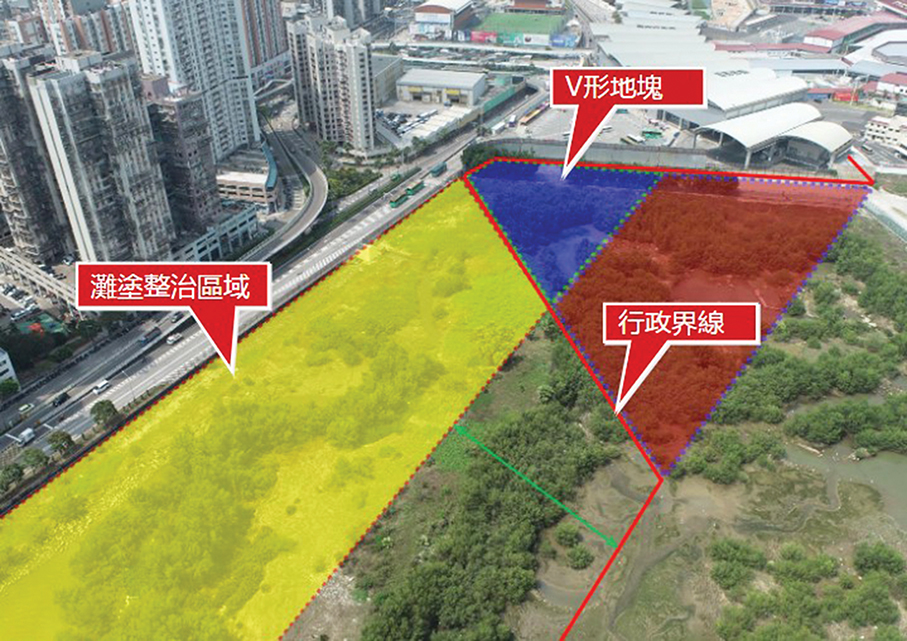 This undated aerial photo released by the Public Works Bureau (DSOP) last year shows the V-shaped plot next to the Barrier Gate checkpoint indicated by the blue area.