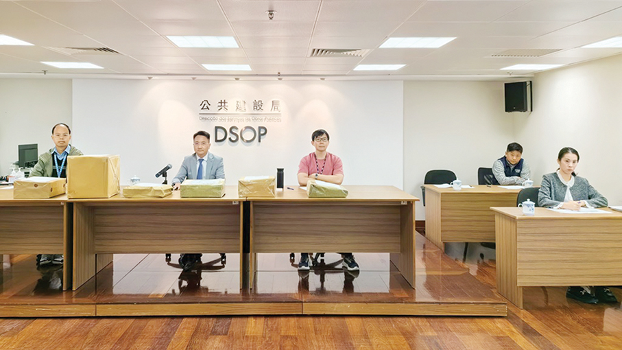 Public Works Bureau (DSOP) officials, including DSOP Director Lam Wai Hou (second from left), pose during yesterday’s session where they unsealed intentions submitted by six construction companies to bid for the Zone A-Nape flyover project. – Photo: DSOP