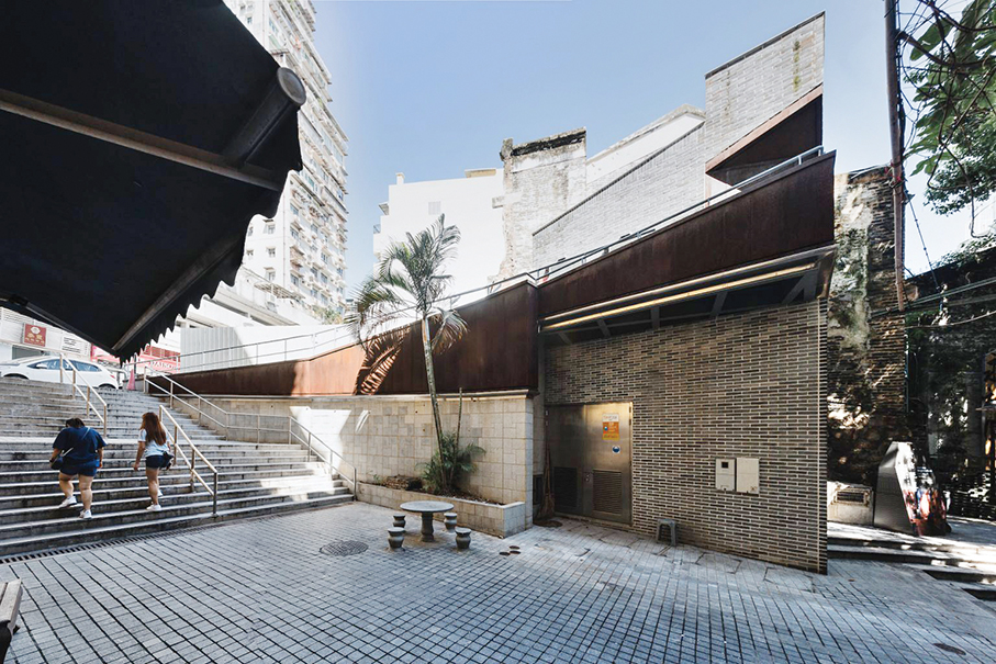 The infrastructure is located in a small sloped piazza above a narrow passage at the bottom of the Beco dos Faitiões courtyard, a government service building in the old part of Macau near the Ruins of St. Paul’s, accommodating a waste collection station and a transformer room commissioned by two municipal entities.