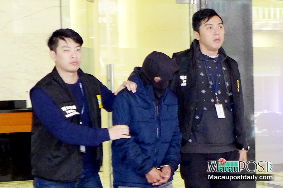Judiciary Police (PJ) officers escort the hooded Filipino robbery suspect from the PJ headquarters to a vehicle yesterday. Photo: Iong Tat Choi