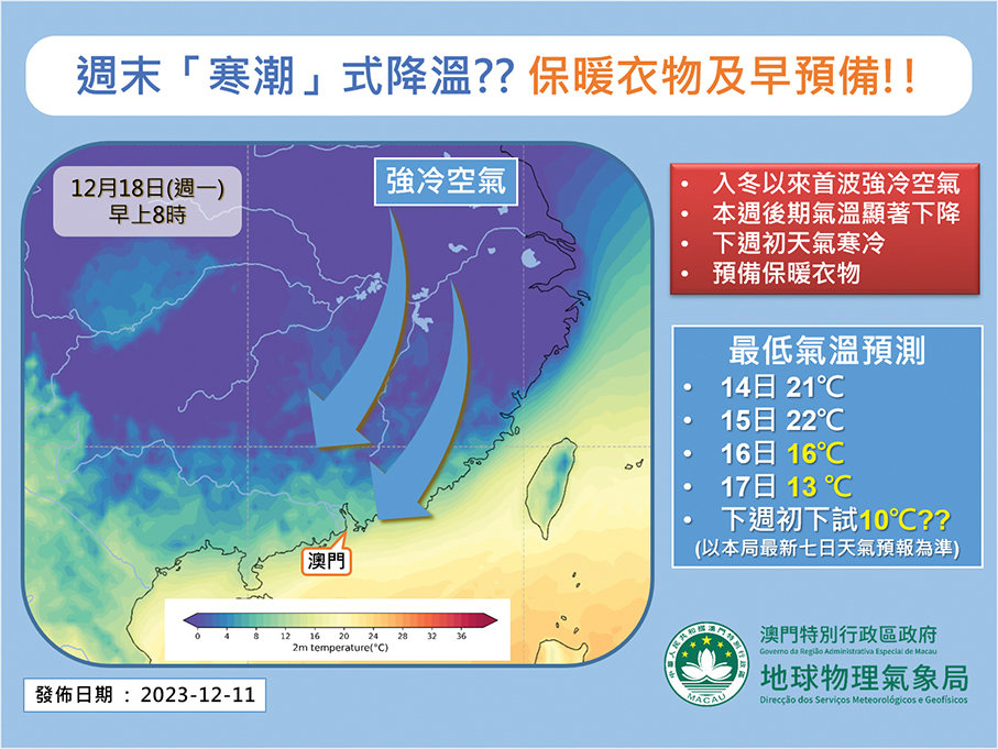 Yesterday’s statement by the Macau Meteorological and Geophysical Bureau (SMG) pointed out that the weekend will usher in the strongest wave of cold air since the beginning of this winter, with the temperature in Guangdong province dropping significantly, together with rain and strong winds, adding that the lowest temperature in the Pearl River Delta (PRD) area was forecast to reach the official “cold” level, which ranges between 12 degrees Celsius and below.