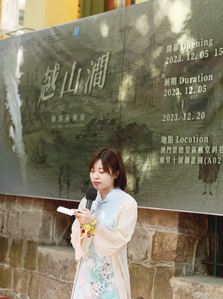 This photo provided by Inês Chan I Lei on Tuesday shows her delivering a speech during the exhibition’s opening ceremony at 10 Fantasia Gallery earlier this month.