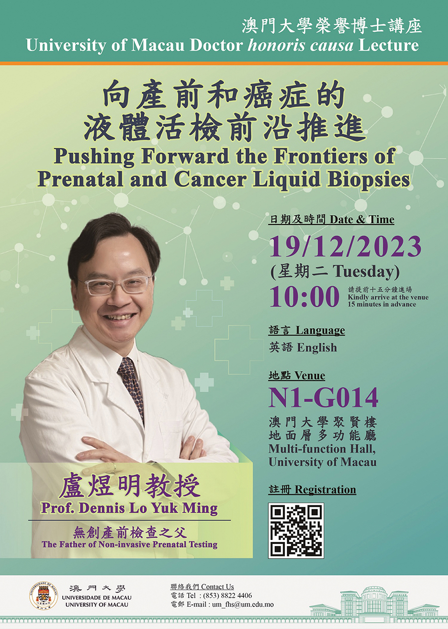 This poster provided by the University of Macau (UM) on Thursday promotes Prof. Dennis Lo Yuk Ming’s lecture slated tomorrow.