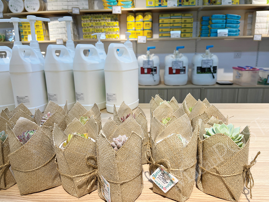 In addition to selling various kinds of “naked products”, i.e., products without packaging, including cleaning goods and the store’s flagship product – bamboo paper towels, as well as potted plants grown by young people with special education needs, the green store also includes products from local cultural creators on consignment.