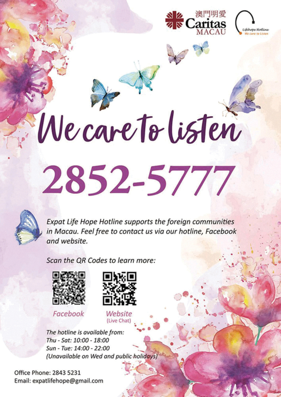 Those needing support are urged to phone Caritas Macau’s Life Hope Hotline on 2852 5222 (Chinese) or Expat Life Hotline on 2852 5777 (English) or the Social Welfare Bureau’s (IAS) 24-hour Counselling Hotline on 2826 1126.
