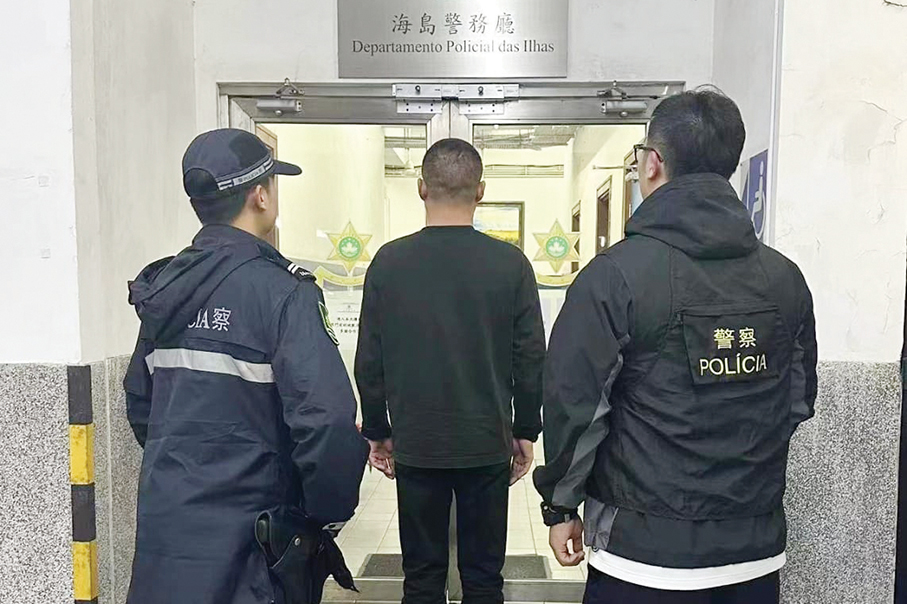 This undated handout photo provided by the Public Security Police (PSP) yesterday shows PSP officers escorting the T-shirt theft suspect from the mainland to a police station in Taipa.