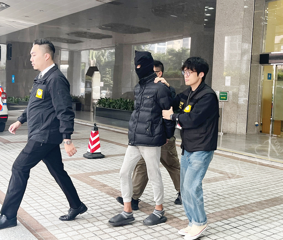 The hooded local male toy shop owner suspected of cheating 50 customers is escorted by Judiciary Police (PJ) officers from the PJ headquarters to a vehicle in Zape after Saturday’s special press conference.