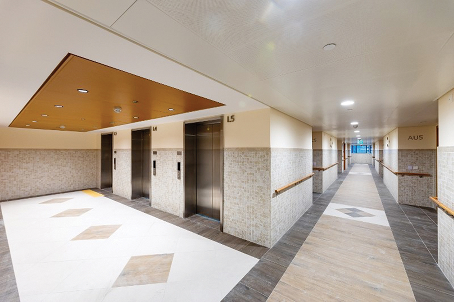 This handout photo downloaded from the Public Works Bureau’s (DSOP) website yesterday shows a lift lobby of the newly-completed rental housing estate for seniors on Plot P in Areia Preta district earlier this month.
