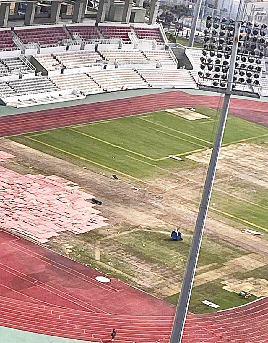 This undated photo circulating on social media platforms shows the damage to the football pitch at the Macau Olympic Sports Centre Stadium in Taipa by two K-Pop gigs held there on January 13-14.