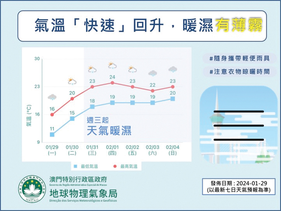 The Meteorological and Geophysical Bureau (SMG) said in a statement that under the influence of an “easterly airstream”, the weather over the coming two days was set to be mainly cloudy with a few showers, while the lowest temperature in the middle and later part of this week was forecast to “quickly” rise to 18 degrees or even above.
