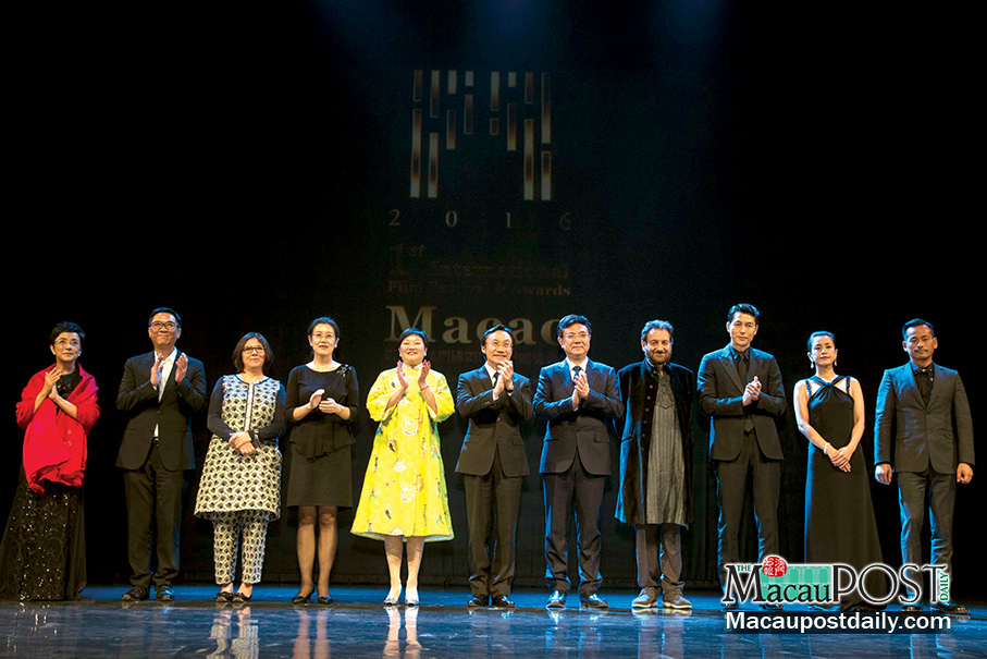 Opening ceremony officiating guests comprising Secretary for Social Affairs and Culture Alexis Tam Chon Weng (centre), Chief Executive Fernando Chui Sai On’s wife Winnie Fok Wai Fun (fifth from left), Deputy Director of the Liaison Office of the Central People’s Government in Macau, Xue Xiaofeng (fifth from right), Head of the Section of Public Diplomacy and Information of the Office of the Commissioner of the Ministry of Foreign Affairs in Macau Li Nan (fourth from left), IFFAM Jury President Shekhar Kapur (fourth from right), jury members, Giovanna Fulvi, Jung Woo Sung, Stanley Kwan and Makiko Watanabe, as well as Macau Government Tourism Office (MGTO) Director and IFFAM Organizing Committee President Maria Helena de Senna Fernandes (left), IFFAM organiser MFTPA President and IFFAM Organizing Committee Executive Vice President Alvin Chau (right) pose for a photo at the Macau Cultural Centre last night. Photo: GCS