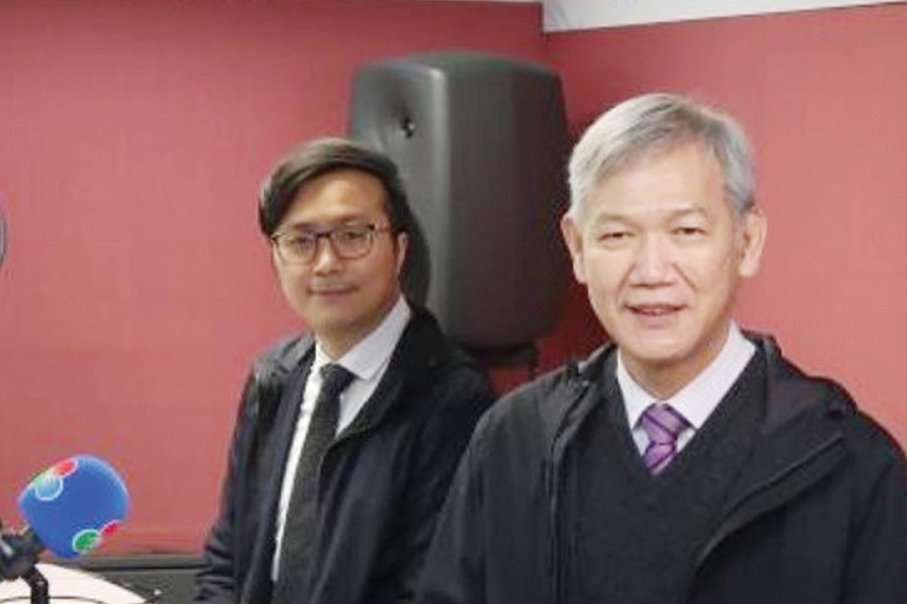 Social Welfare Bureau (IAS) official Choi Sio Un (right) and IAS Rehabilitation Service Division’s Rehabilitation Service Support Unit official Yu Ka Wai attend yesterday’s phone-in programme hosted by public broadcaster TDM’s Chinese-language radio channel. – Photo courtesy of TDM
