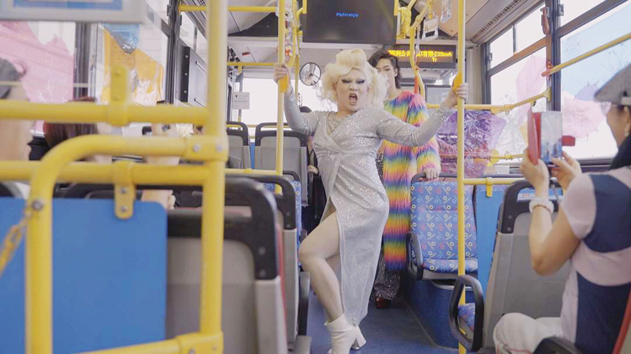 As the bus passed the casinos in Cotai, Yuan invited the imaginary city’s “model citizens” to get on the bus to perform - three drag queens took the stage in turn, lip-synching and dancing while interacting with the audience.