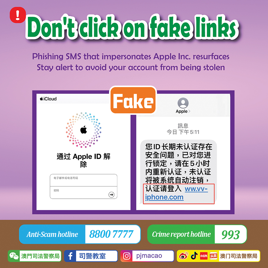 This poster provided by the Judiciary Police (PJ) yesterday warns members of the public of the phishing SMS from Apple impersonators.
