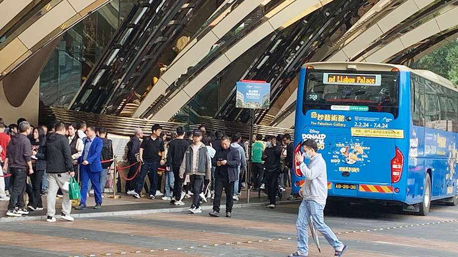 Caption: Tourists queue for a free shuttle bus ride in front of Macau's Grand Lisboa casino-hotel on the peninsula this afternoon. – Photo: Carl Leong