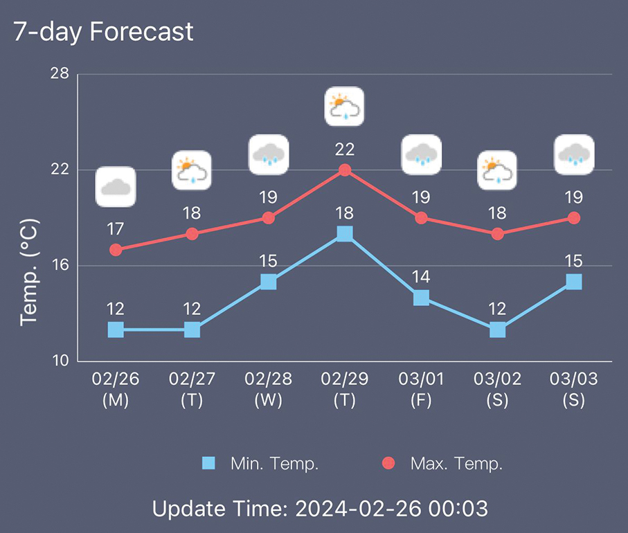 This chart provided by the Meteorological and Geophysical Bureau (SMG) mobile app early today shows its temperature forecast for the next few days.