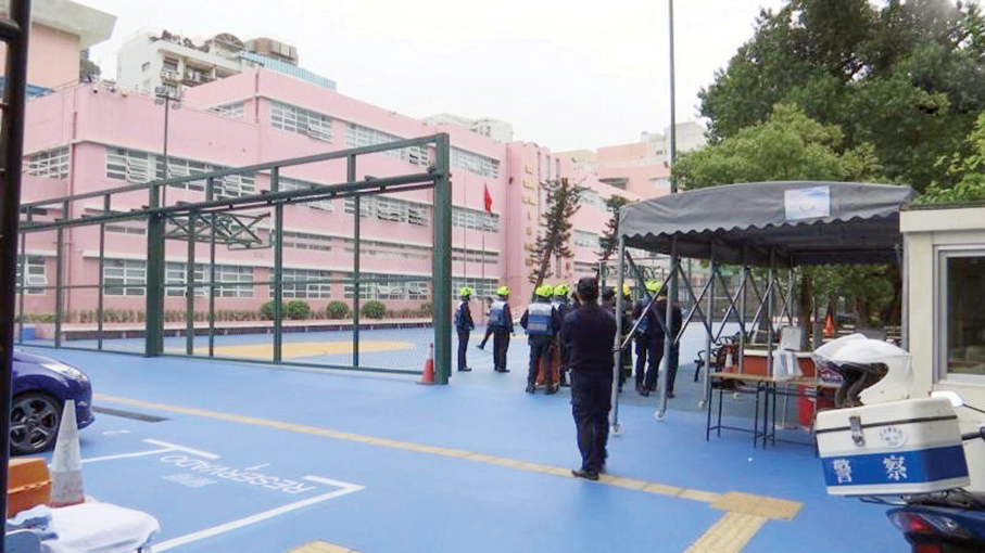 Firemen work at the public Luís Gonzaga Gomes Luso-Chinese Secondary School on Avenida de Sidónio Pais after a blaze broke out at the school’s lumber room yesterday. – Photo courtesy of TDM