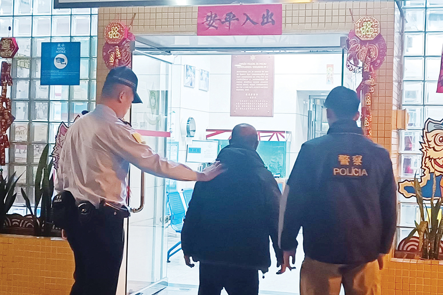 This undated handout photo provided by the Public Security Police (PSP) yesterday shows PSP officers escorting the sexual assault suspect to the Nam Van Police Station.