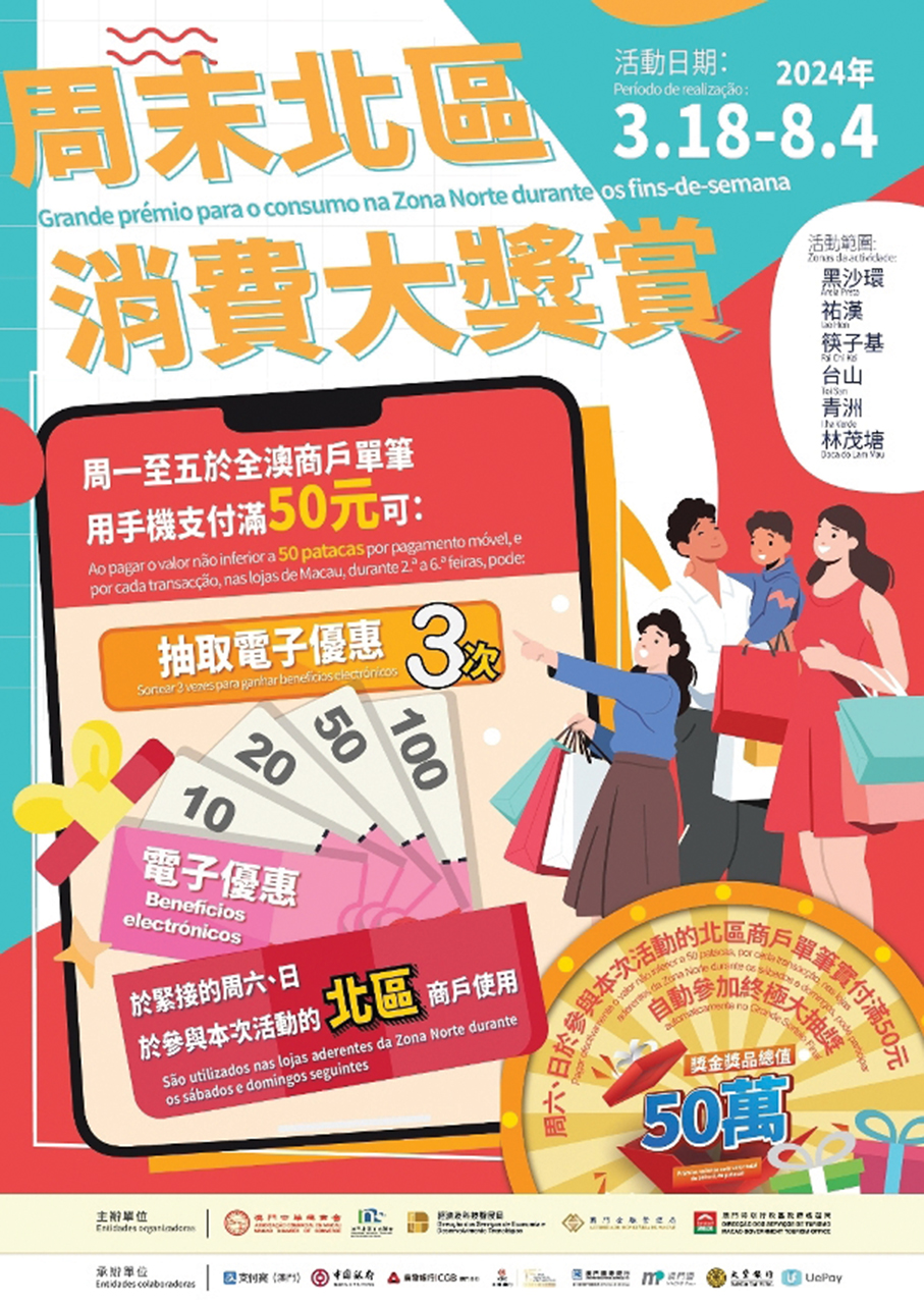 The government and the Macau Chamber of Commerce (ACM) will hold a “Weekend Consumer Rewards in Northern District” promotional activity from March 18 to August 4, where users will be able to take part in lucky draws for e-coupons after they consume at least 50 patacas in the northern district through e-payment on weekdays, and the coupons can only be used during weekends, ACM President Frederico Ma Chi Ngai said yesterday.