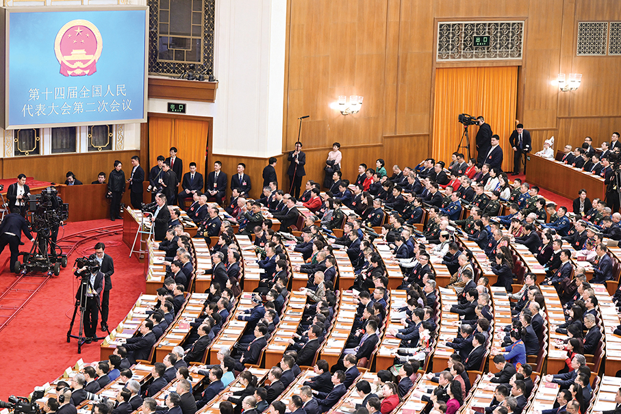 Lawmakers attend the opening meeting of the second session of the 14th National People’s Congress (NPC) at the Great Hall of the People in Beijing yesterday. – Xinhua